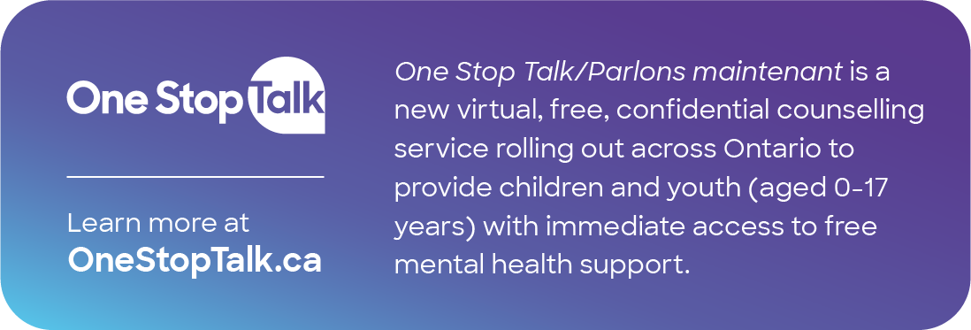 In Ontario, you and/or your child or youth can call One Stop Talk. One Stop Talk offers children and youth under the age of 18 a free, one-hour, confidential therapy session in their preferred language and can help connect them to community-based services if additional support is needed.